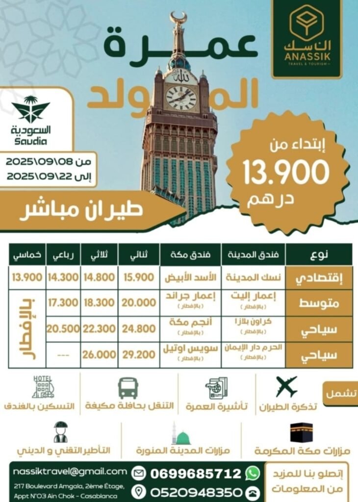 تغسل ذنوبك وتُجدد عهدك مع ربك؟ العمرة فضائلها عظيمة، فهي كفارة للذنوب، وتُطهّر القلب والروح. لا تفوت فرصة أداء هذه الشعيرة المباركة في أجواء المولد النبوي الشريف، مع وكالة « الناسك للسفر » التي ستجعل من رحلتك تجربة لا تُنسى.