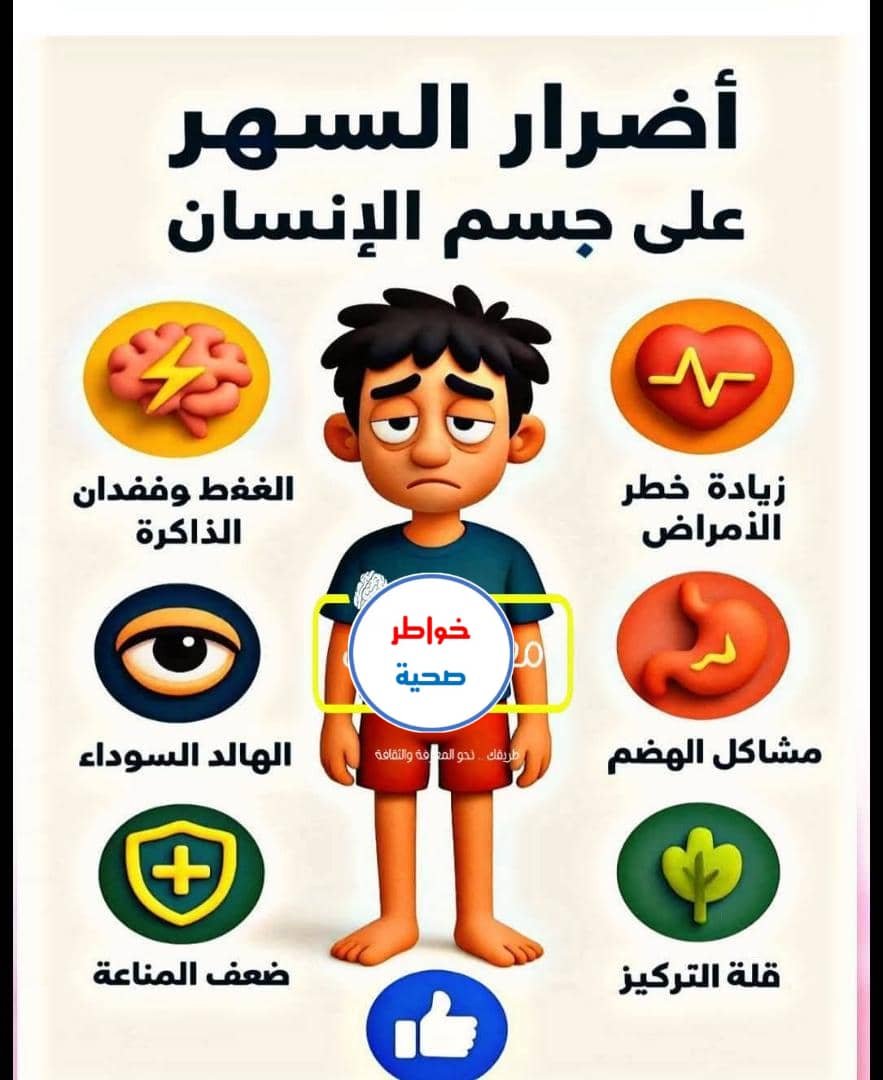 جسم الإنسان مُبرمج بيولوجيًا على النوم ليلًا والاستيقاظ نهارًا. يؤدي السهر إلى تعطيل هذه الساعة الداخلية، مما يسبب: