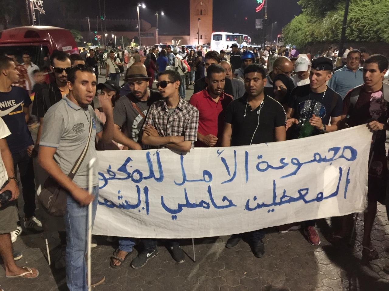 يشهد محيط مدخل ممر البرانس بجامع الفنا منذ ليلة الاثنين و الثلاثاء تاسع شتنبر الجاري استنفارا أمنيا لافتا لمختلف الأجهزة الأمنية و السلطات المحلية بالمدينة، و ذلك بعد دخول مجموعة من المكفوفين المنضوين في مجموعة الأمل للمعطلين المكفوفين حاملي الشواهد ، حيث يطالبون بإيجاد حلول تحفظ كرامتهم و تضع حدا لمعاناتهم مع العطالة. و قامت هذه المجموعة من المكفوفين أن قاموا وقفة احتجاجية في فاتح أبريل الماضي أمام ولاية جهة مراكش أسفي للمطالبة بالاستجابة لملفهم المطلبي.