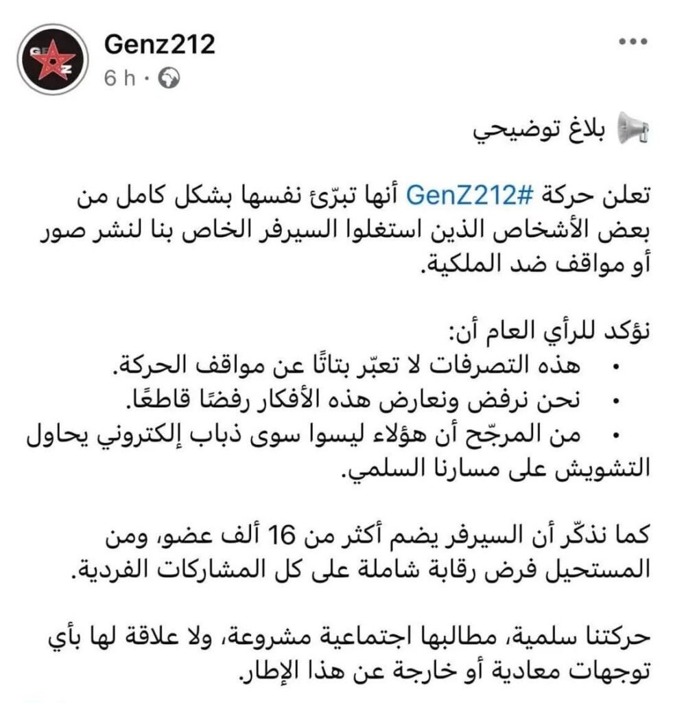 ورجحت « GenZ212 » في بيانها أن « هؤلاء الأشخاص ليسوا سوى ذباب إلكتروني يحاول التشويش على مسارها السلمي ».