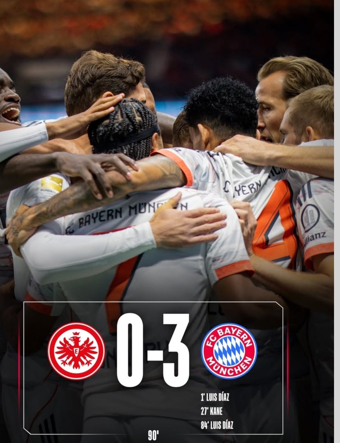 بايرن ميونخ 3‑0 أينتراخت فرانكفورت — فوز نظيف خارج ملعبه عزز صدارة الفريق البافاري.