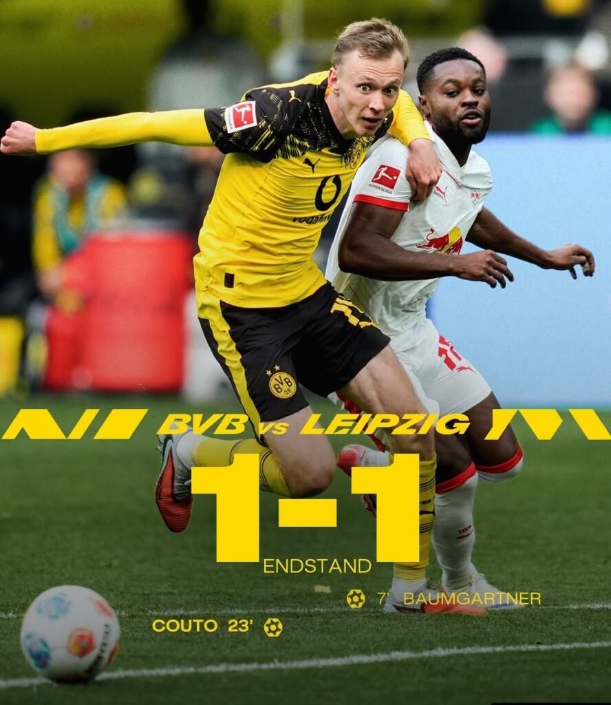 بوروسيا دورتموند 1‑1 آر بي لايبزيغ — تعادل مثير بين الفريقين الكبيرين، بعد أن تقدم لايبزيغ عبر باومغارتنر وتعادل دورتموند عن طريق يان كوتو.