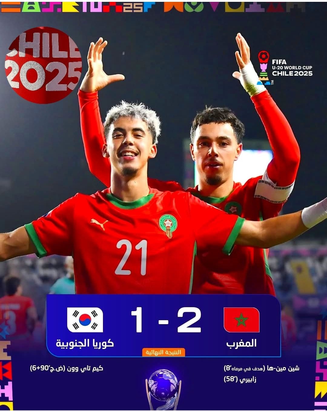 وفي سياق متصل، واصل المنتخب المغربي لأقل من 20 سنة « أشبال الأطلس » رحلته المتميزة في مونديال الشيلي، بعدما تفوق على نظيره الكوري الجنوبي بنتيجة (2-1)، ضمن منافسات ثمن نهائي البطولة.
