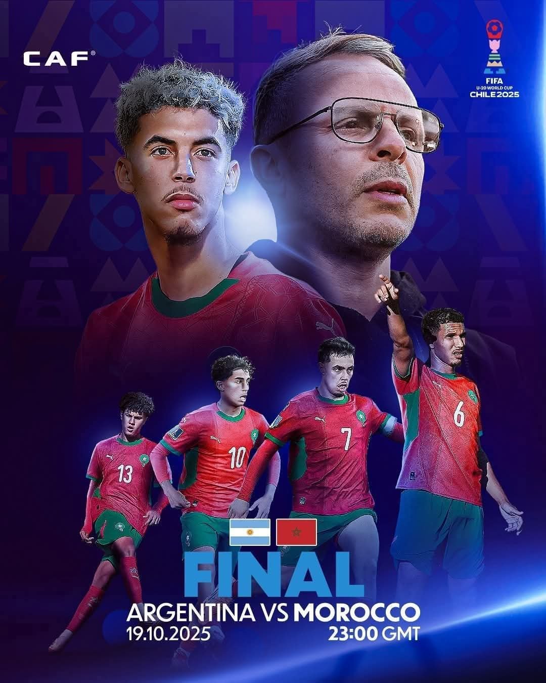 في نهائي كأس العالم تحت 20 سنة 2025 بالشيلي، يواجه المنتخب الوطني المغربي نظيره الأرجنتيني في مباراة تاريخية تُقام مساء اليوم الأحد 19 أكتوبر 2025، على أرضية ملعب « استاديو خوليو مارتينيز برادانوس » في العاصمة سانتياغو.