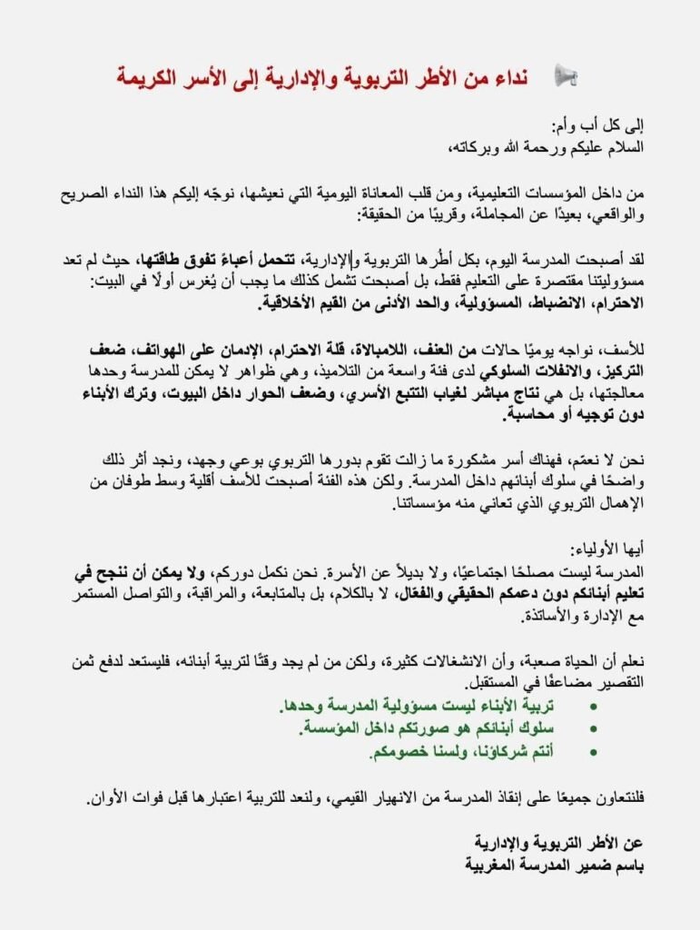 شددت الرسالة على أن المدرسة ليست مصلحة اجتماعية أو بديلاً عن الأسرة، بل شريك للأسر في تكوين الأبناء. وذكرت أن هناك أسرًا لا تزال تقوم بدورها التربوي بوعي، إلا أن الفئة الأكبر من الأسر تهمل هذه المسؤولية، مما ينعكس سلبًا على الأداء الدراسي والانضباط داخل المدارس.