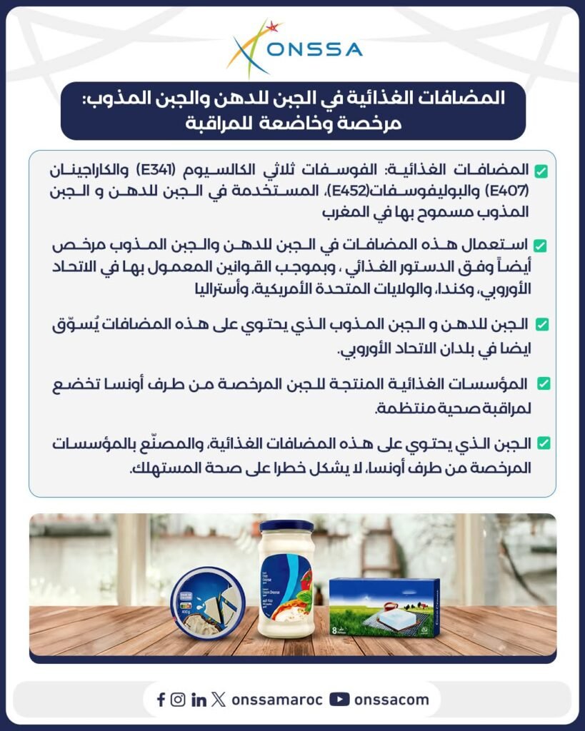 وفي بلاغ نشره المكتب على صفحته الرسمية بموقع “فايسبوك”، أكد أن المضافات الغذائية المستعملة في الجبن للدهن والجبن المذاب بالمغرب مرخصة وخاضعة لمراقبة صارمة. ويتعلق الأمر بكل من الفوسفات ثلاثي الكالسيوم (E341) والكاراجينان (E407) والبوليفوسفات (E452).