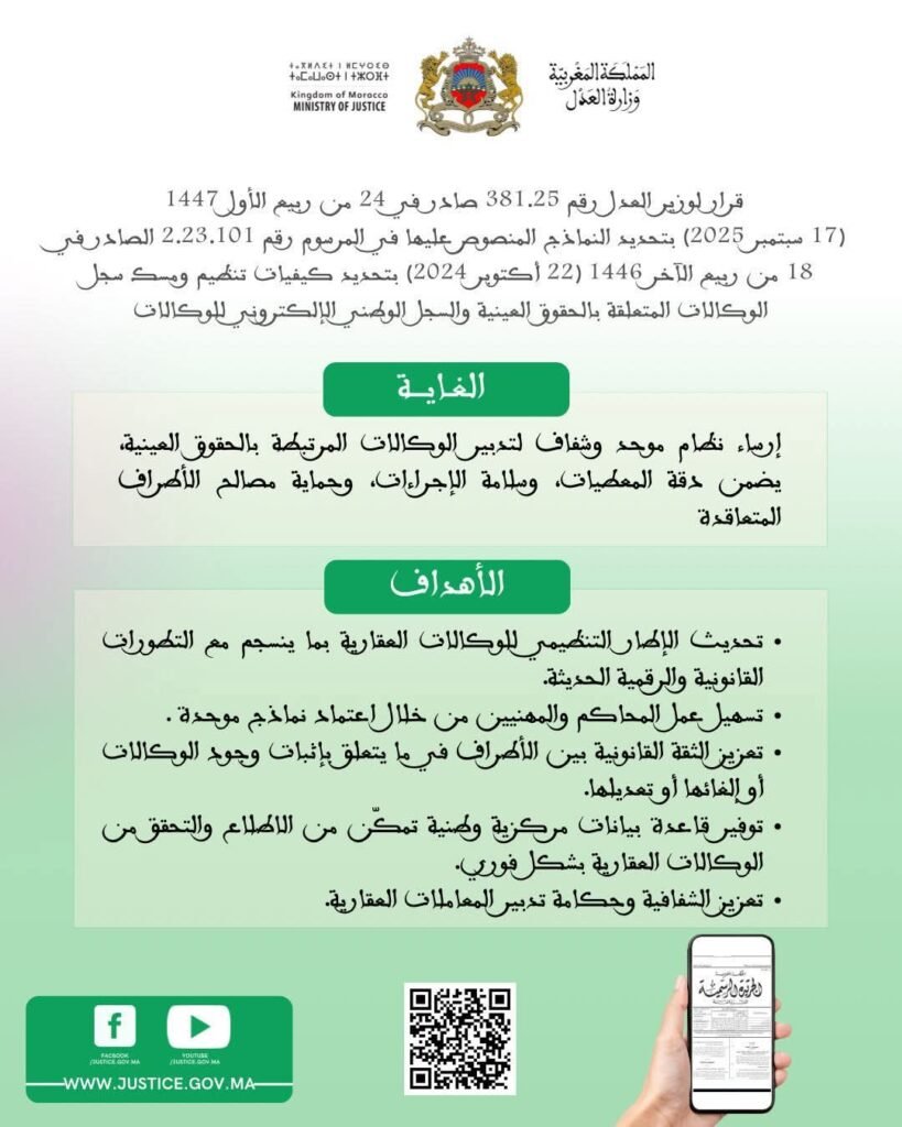 ويهدف هذا القرار إلى إرساء نظام موحد وشفاف لتدبير الوكالات المرتبطة بالحقوق العينية، يضمن دقة المعطيات وسلامة الإجراءات القانونية، ويُؤمِّن حماية مصالح جميع الأطراف المتعاقدة. كما يندرج في إطار المسار الوطني لتحديث منظومة العدالة والتحول الرقمي للخدمات القانونية، من خلال رقمنة عمليات تسجيل الوكالات وتوثيقها بشكل يتيح تتبعها إلكترونيًا ويحد من حالات التلاعب أو التزوير.