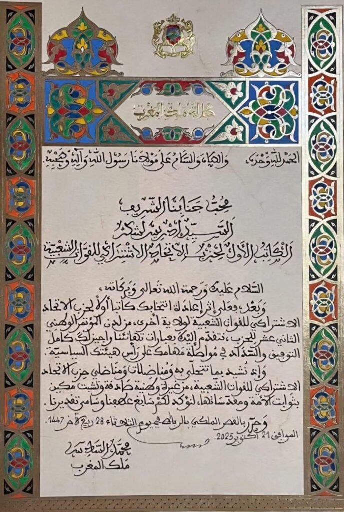 بعث جلالة الملك محمد السادس نصره الله وأيده برقية تهنئة إلى السيد إدريس لشكر، بمناسبة تجديد الثقة فيه كاتبًا أول لحزب الاتحاد الاشتراكي للقوات الشعبية، خلال المؤتمر الوطني الحادي عشر للحزب.