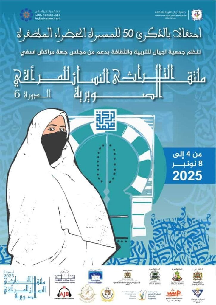 تحتضن مدينة الصويرة من الرابع إلى الثامن نونبر المقبل فعاليات النسخة السادسة لملتقى التراث النسائي، من تنظيم جمعية أجيال للتربية و الثقافة، بدعم من مجلس جهة مراكش أسفي، و ذلك تخليدا للذكرى الخمسين للمسيرة الخضراء، و يتضمن برنامج هذا الملتقى : أنشطة متنوعة تشمل الندوات العلمية و الورشات التكوينية و المسابقات التراثية ، إضافة إلى العروض الفنية بمشاركة نساء مبدعات في مختلف المجالات، في أجواء احتفالية تجسد روح المسيرة الخضراء و قيم الوحدة و الاعتزاز بالهوية الوطنية، و يعد هذا الملتقى محطة أساسية و جسر تواصل بين شباب جمعية أجيال للتربية و الثقافة و شباب مدينة الصويرة بتاريخ هذه المدينة الذي يجسد حصرهم على الموروث الثقافي المتنوع الذي تزخر به المنطقة.