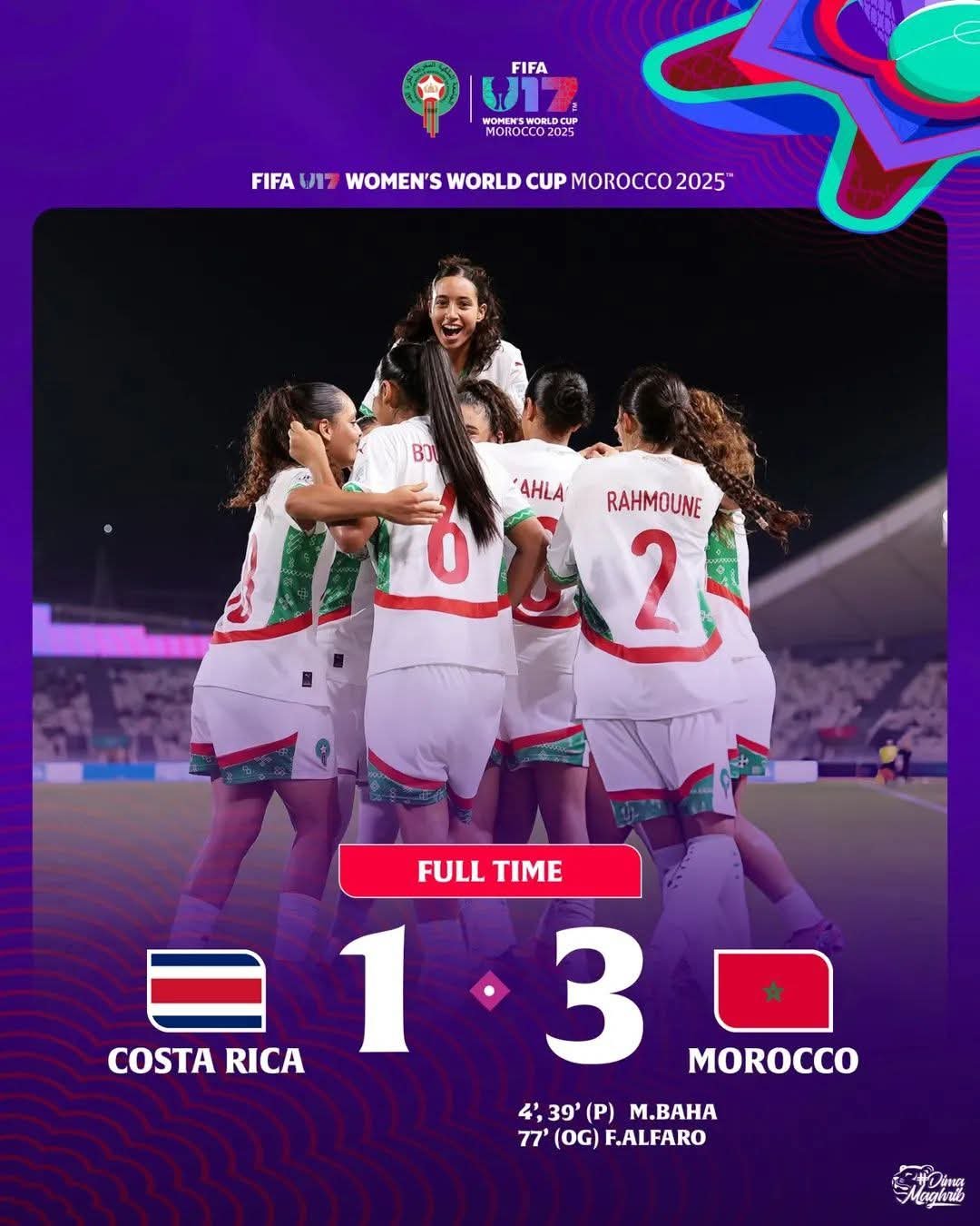 حقق المنتخب المغربي للسيدات لأقل من 17 سنة فوزه الأول في كأس العالم للناشئات، بعد تغلبه على منتخب كوستاريكا بثلاثة أهداف مقابل هدف واحد، مساء الجمعة على أرضية الملعب الأولمبي بالرباط، ضمن الجولة الأخيرة من دور المجموعات.