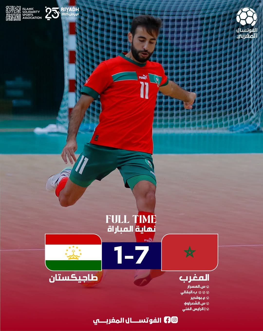 في عرض كروي متميز، حقق المنتخب المغربي لكرة القدم داخل القاعة فوزاً ساحقاً على منتخب طاجيكستان بنتيجة 7-1، خلال المباراة التي جمعت بين الفريقين يوم الخميس بمدينة الرياض، ضمن الجولة الثانية من مباريات المجموعة الثانية في دورة ألعاب التضامن الإسلامي. و