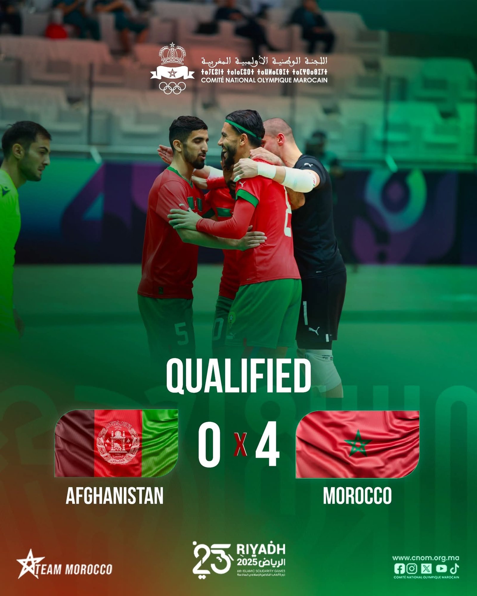 هنيئاً للمنتخب الوطني المغربي لكرة القدم داخل القاعة على تأهله المستحق إلى دور نصف النهائي، بعد فوزه الساحق على منتخب أفغانستان بنتيجة 4 – 0، في مباراة تألق فيها الأسود أداءً ونتيجة، حيث