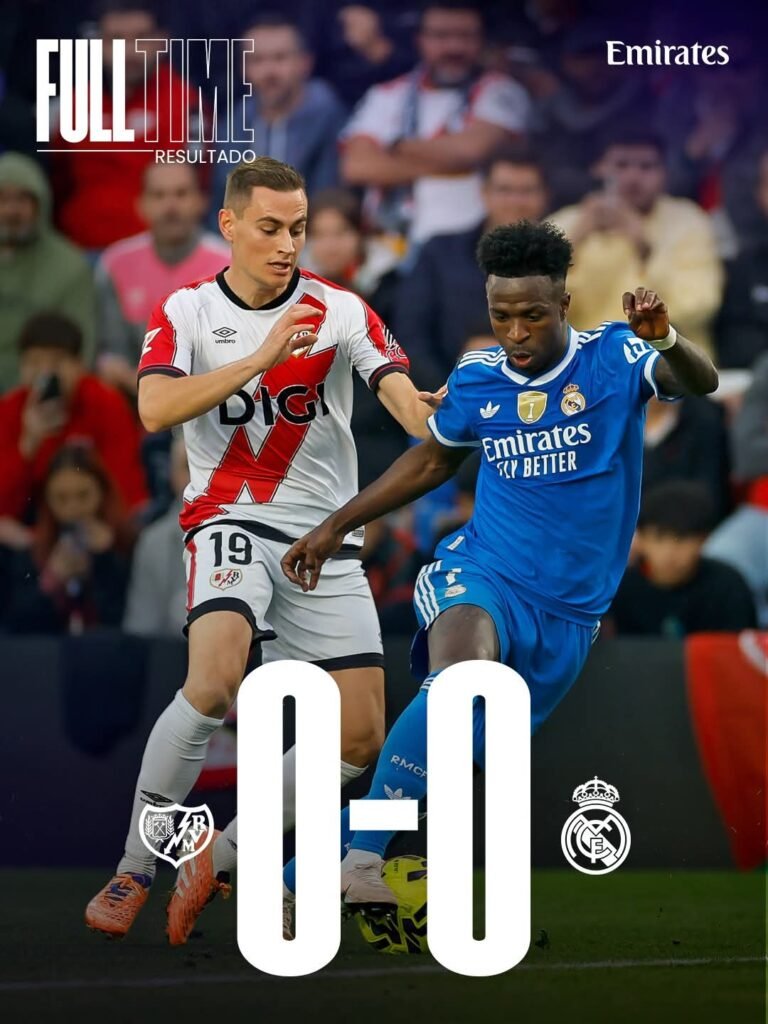 أما ريال مدريد فقد اصطدم بعناد رايو فاييكانو واكتفى بتعادل سلبي 0-0، ليهدر نقطتين ثمينتين كانتا كفيلتين بتوسيع الفارق عن ملاحقيه. الفريق الملكي ظهر أقل فعالية هجومية رغم سيطرته على الكرة في معظم فترات اللقاء.