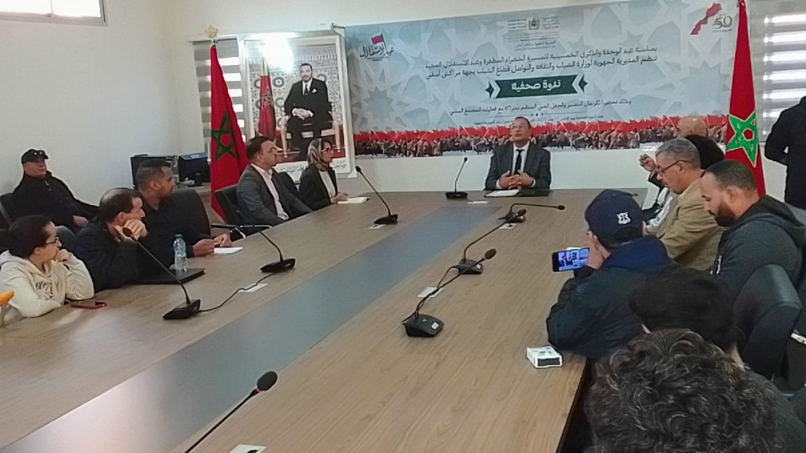 الندوة الصحفية المنعقدة يومه الاثنين 2025.11.17، بالمديرية الجھوية للشباب والتقافة والتواصل قطاع الشباب والذي حضرھا عدد من الصحفيين والصحفيات ومجتمع مدني وبعض موظفي الإدارة الندوة تطرق فيھا المندوب الجھوي عزيز معتصم عن تنظيم كرنفال بمناسبة عيد الوحدة والمسيرة الخضراء المظفرة وعيد الاستقلال، المقرر تنظيم ھدا الحفل الجھوي يوم الخميس 20 أكتوبر 2025 ابتداءا من الساعة الخامسة مساءا والذي أكد فيه المندوب الجھوي عزيز معتصم على أھميته بعد اعتلاء المغرب على صحرائه بقيادة رائد الأمة المغربية جلالة الملك محمد السادس نصرھ الله وأيده.