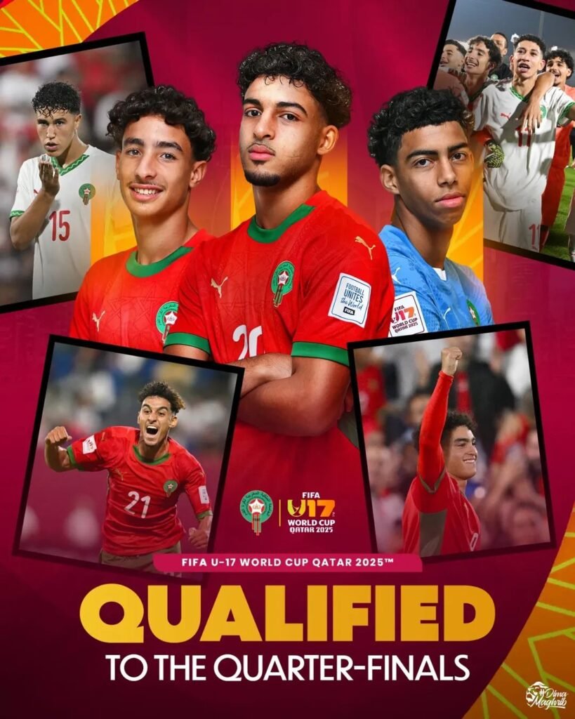خطف المنتخب الوطتي المغربي أقل من 17 سنة بطاقة التأهل إلى دور ربع النهائي في كأس العالم، بعد فوزه المثير على منتخب مالي بثلاثة أهداف لهدفين، ليواجه في الجولة المقبلة منتخب البرازيل.حيث