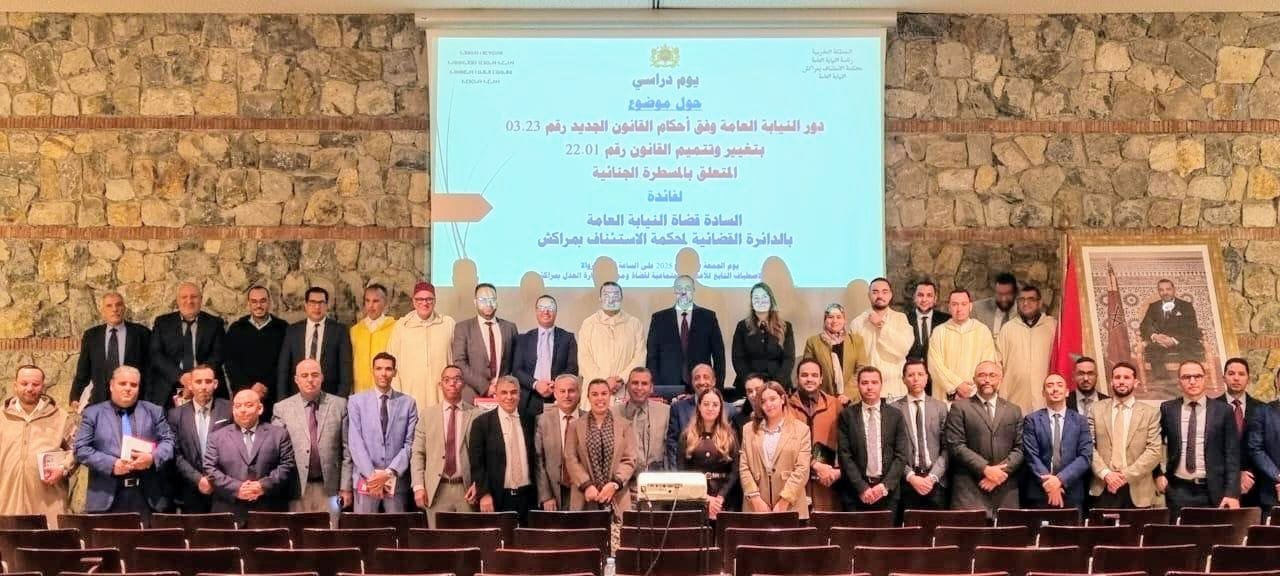 احتضنت محكمة الاستئناف بمراكش، يوم الجمعة 21 نونبر 2025، فعاليات يوم دراسي نظمَه السيد خالد كردودي الوكيل العام للملك، خُصص لتسليط الضوء على دور النيابة العامة وفق أحكام القانون الجديد رقم 03.23 المغير والمتمم للقانون رقم 22.01 المتعلق بالمسطرة الجنائية.
