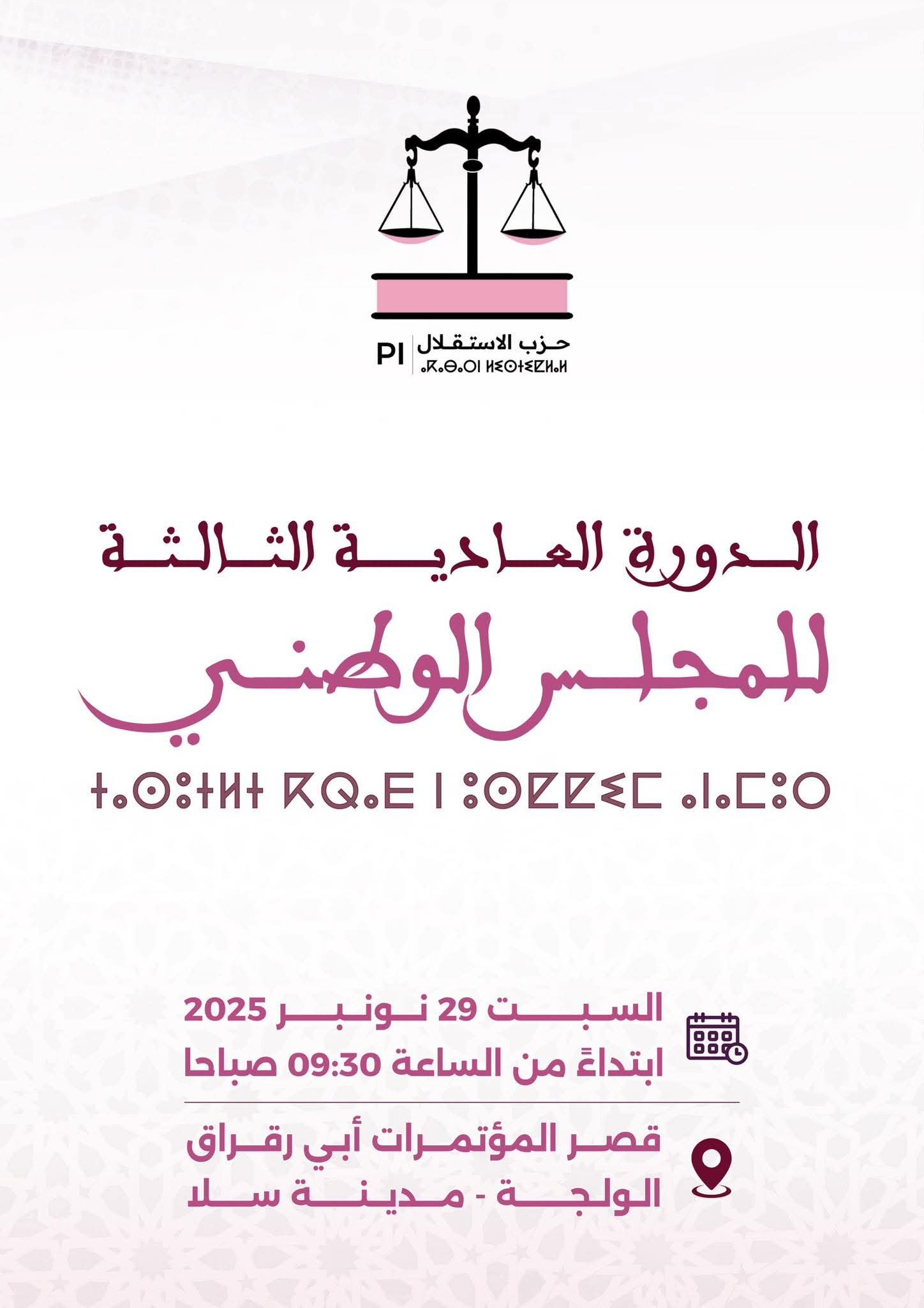 يعقد حزب الاستقلال، يوم غد السبت 29 نونبر 2025 ابتداءً من الساعة 9:30 صباحا بقصر المؤتمرات أبي رقراق – الولجة بمدينة سلا، الدورة العادية الثالثة لمجلسه الوطني التي سيترأس أشغالها الأخ عبد الجبار الرشيدي رئيس المجلس، وذلك طبقا لمقتضيات الفصلين 89 و94 من النظام الأساسي للحزب، كما صادق عليه المؤتمر العام الثامن عشر.