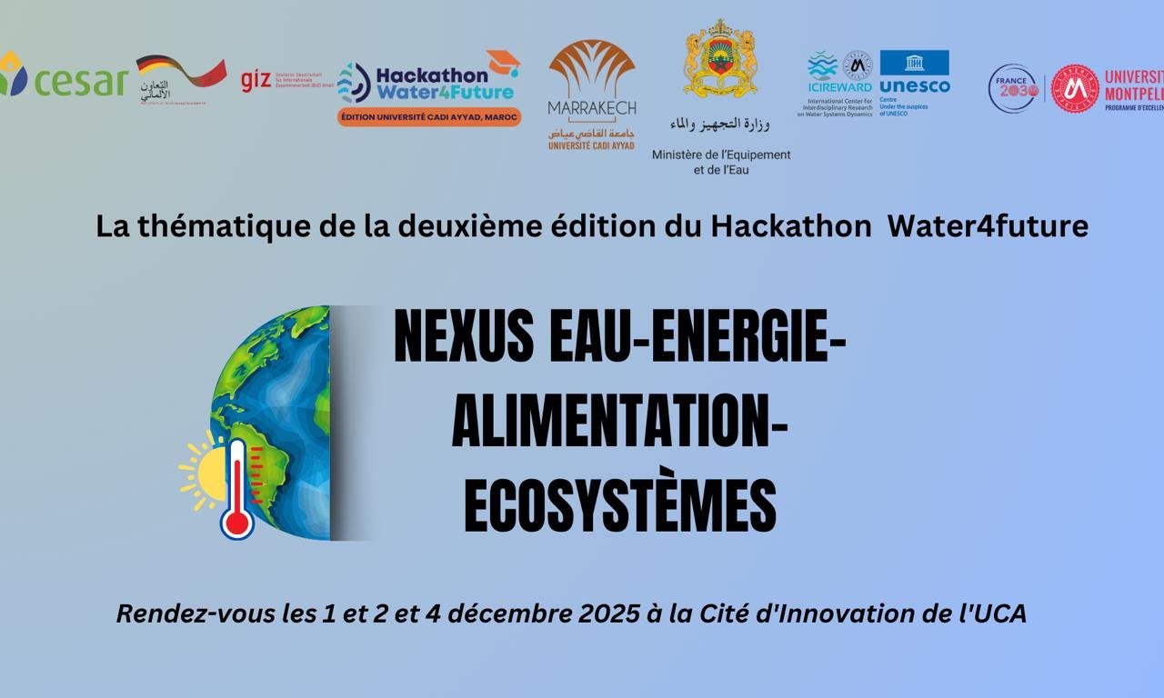 تنظم جامعة القاضي عياض النسخة الثانية من هاكاثون *Water4Future*، المخصص هذه السنة لموضوع الترابط بين الماء والطاقة والغذاء والأنظمة البيئية، باعتباره أحد أهم محاور التنمية المستدامة. ويهدف الحدث إلى تشجيع مقاربة شمولية لمواجهة تحديات التغير المناخي وندرة الموارد، عبر تعزيز الابتكار وإنتاج حلول عملية تجمع بين مختلف القطاعات.