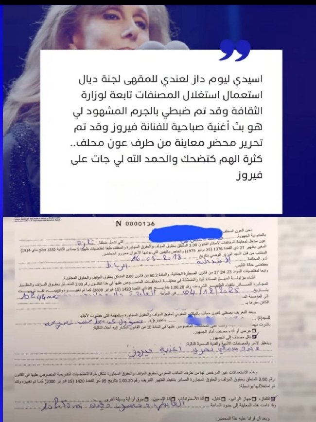 أثار محضرٌ منسوب إلى لجنة تابعة لوزارة الثقافة موجة جدل واسعة بمدينة تازة، بعد تداول وثيقة تتضمن معاينة تشغيل أغنية للفنانة اللبنانية فيروز داخل أحد المقاهي دون احترام مساطر استغلال المصنفات الفنية المحمية بحقوق المؤلف.