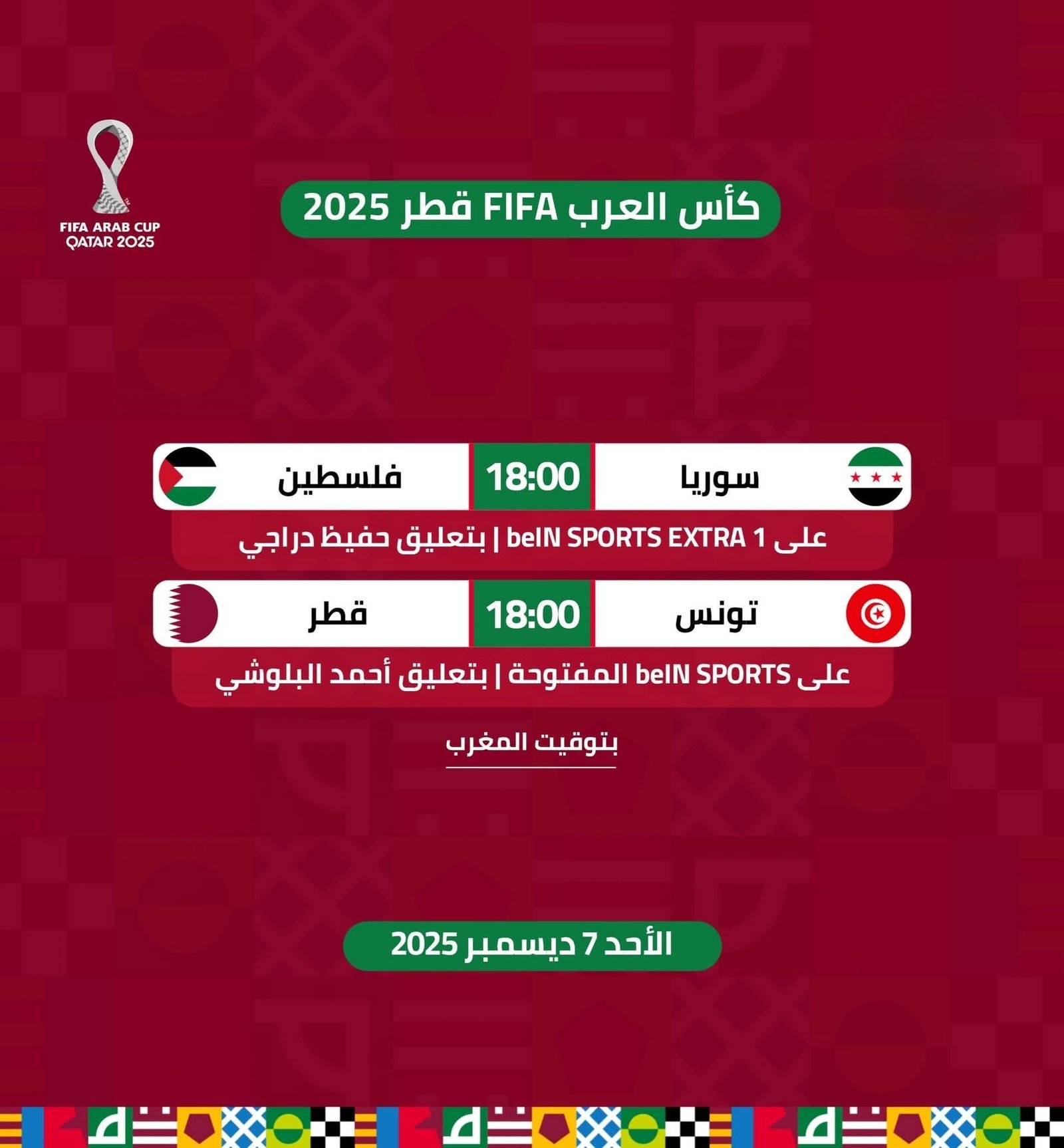 ويحتاج المنتخب القطري إلى الانتصار أمام تونس وانتظار تعادل سوريا وفلسطين من أجل تعزيز فرصه في العبور، بينما يلعب المنتخبان الشقيقان السوري والفلسطيني بأريحية أكبر، إذ يكفيهما التعادل لضمان التأهل.