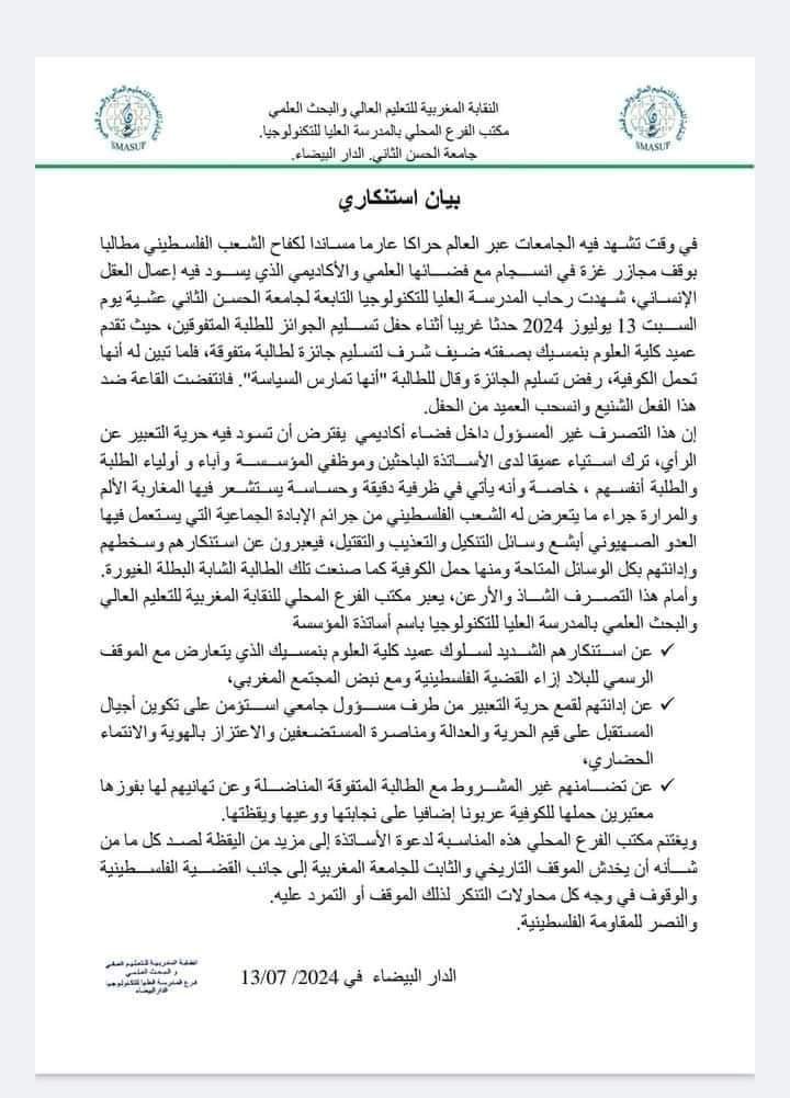 استنكر مكتب الفرع المحلي للنقابة المغربية للتعليم العالي والبحث العلمي بالمدرسة العليا للتكنولوجيا، بشدة سلوك عميد كلية العلوم بنمسيك بصفته ضيف شرف حفل تسليم الجوائز للطلبة المتفوقين شهده رحاب المدرسة العليا للتكنولوجيا التابعة لجامعة الحسن الثاني عشية يوم أمس السبت 13 يوليوز 2024، كاشفا أن العميد لما تبين له أن طالبة متفوقة تحمل الكوفية الفلسطينة، رفض تسليمها الجائزة وقال للطالبة « أنها تمارس السياسة ».