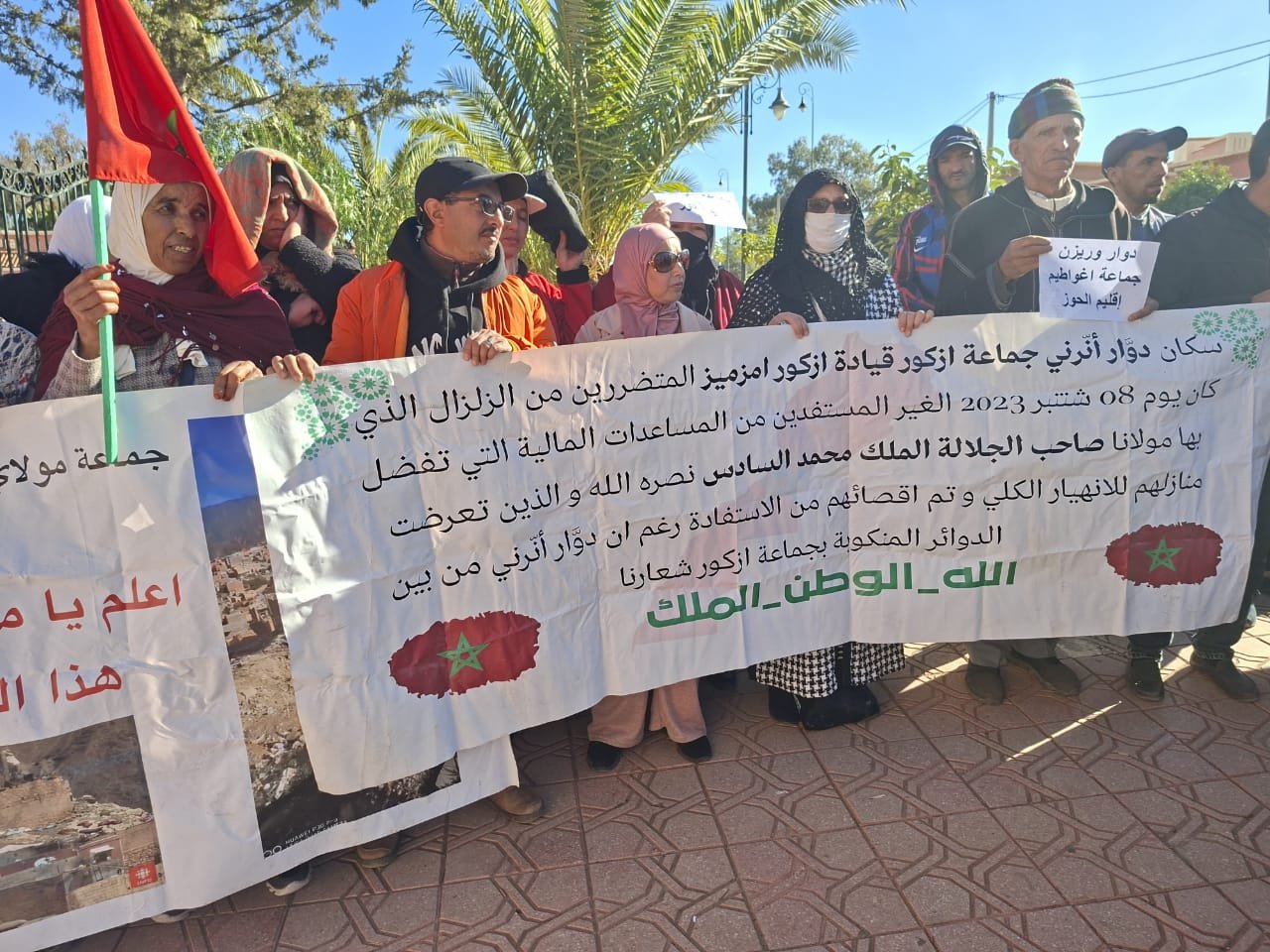 نظم مجموعة من المواطنين المتضررين من زلزال الحوز الماضي وقفة احتحاجية أمام مقر عمالة الحوز بمدينة تحناوت ، تنديدا و استنكارا بما وصفوه اختلالات شابت عملية صرف التعويضات المخصصة للسكان المتضررين، و قد رفع المحتجون شعارات تطالب بإنصافهم ، و فتح تحقيق عادل و منصف في ما اعتبروه تجاوزات طالت لوائح المستفيدين ببعض الجماعات الترابية من قبل : اسني، زرقطن، تزكين و امزنيز، و مناطق أخرى، على اعتبار أن بعض الأسر التي تضررت فعليا من تداعيات الزلزال لم تدرج اسماؤها ضمن الأشخاص المتضررين، في حين حسب تعبير المحتجين، تم تسجيل أسماء أشخاص آخرين غير متضررين أو خارج الدواوير المتضررة ، كما طالبوا بفتح تحقيق شامل حول دور أعوان السلطة و المنتخبين لضمان الشفافية و الإنصاف، و تصحيح ما يعتبرونه إقصاء غير مبرر للعديد من الأسر المتضررة ، كما طالب المحتجون من خلال هذه الوقفة السلطات الإقليمية و على رأسها عامل إقليم الحوز مصطفى المعزة بالتدخل العاجل لاعادة النظر في الملفات و تمكين كل المتضررين الحقيقيين من من حقوقهم .