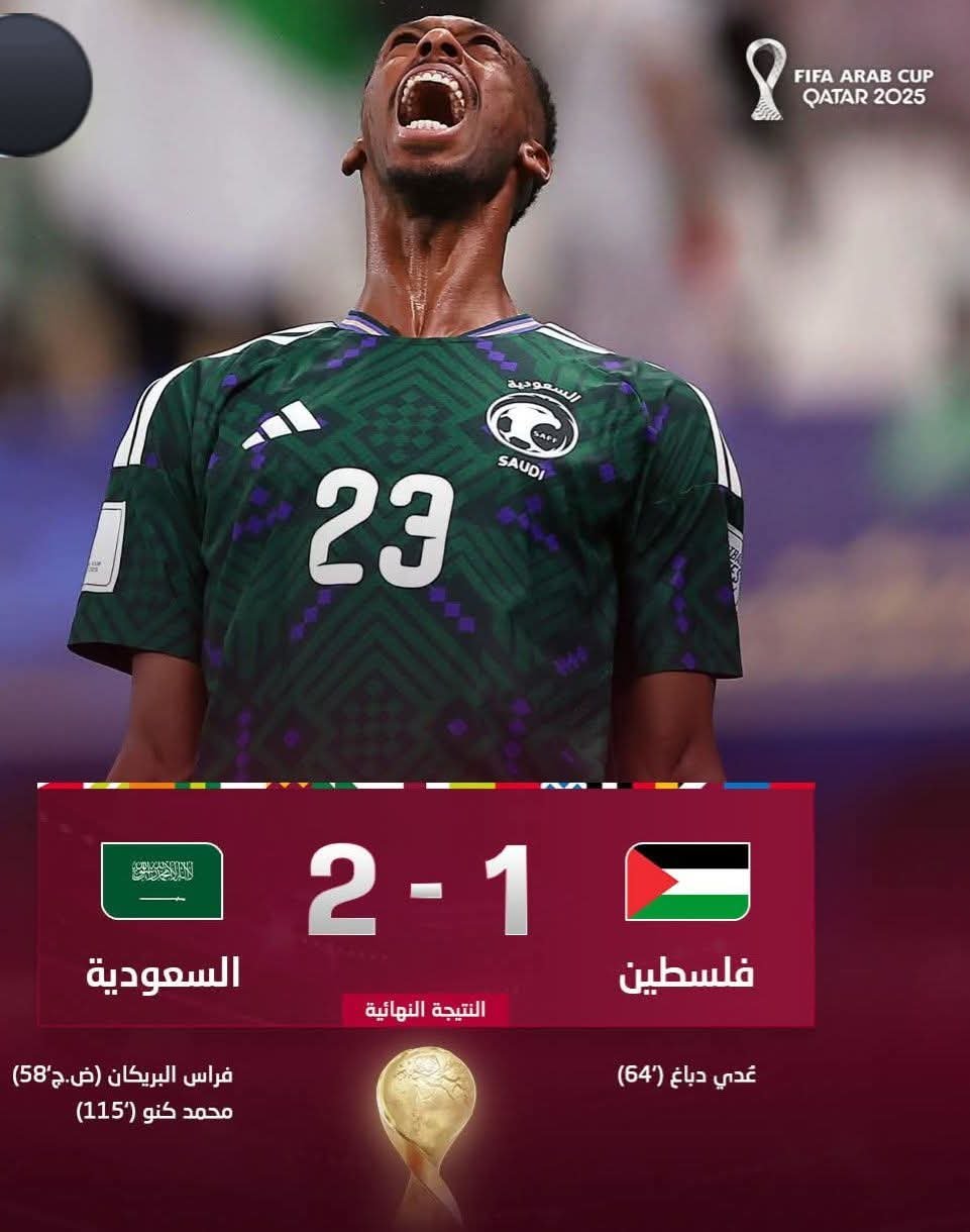 نجح المنتخب السعودي في خطف بطاقة التأهل إلى نصف نهائي كأس العرب 2025، بعد انتصار صعب ومثير على منتخب فلسطين بنتيجة 2 – 1 عقب الاحتكام إلى الأشواط الإضافية، في المباراة التي احتضنها استاد لوسيل بالدوحة مساء الخميس 11 دجنبر 2025.