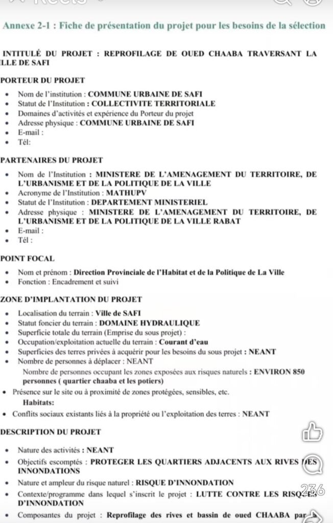الوثيقة، وهي عبارة عن بطاقة تقديم مشروع صادرة في إطار برامج محاربة مخاطر الفيضانات، تؤكد أن حوالي 850 شخصاً كانوا يقطنون بمناطق مصنفة ضمن المجالات المعرضة للخطر، خاصة بأحياء الشعبة والخزافين والمناطق المجاورة لمجرى الواد.