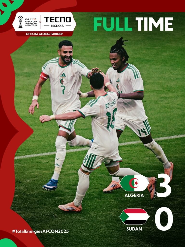 الجزائر 3–0 السودان – بداية قوية للجزائر مع أداء ممتاز من رياض محرز.