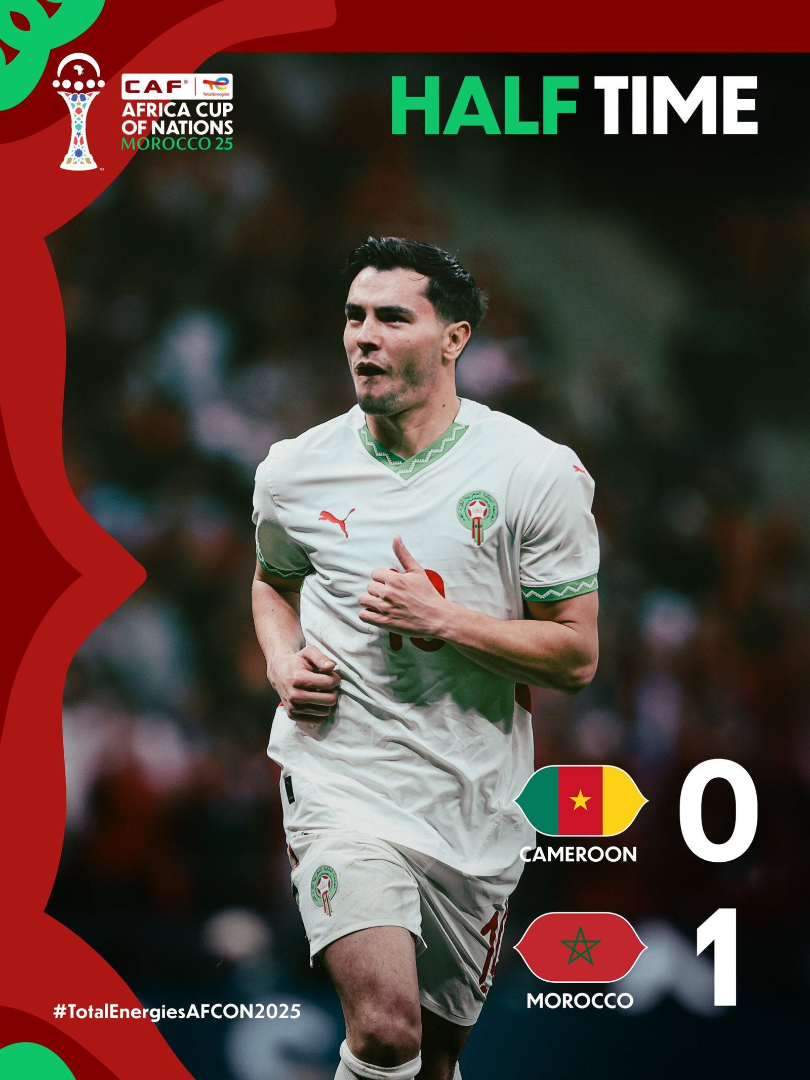فرض المنتخب الوطني سيطرته خلال الشوط الأول، ونجح في ترجمتها إلى هدف التقدم، مقابل اعتماد المنتخب الكاميروني على الدفاع مع بعض المحاولات الهجومية الخجولة، التي اصطدمت بدفاع مغربي منظم وحاضر بقوة.