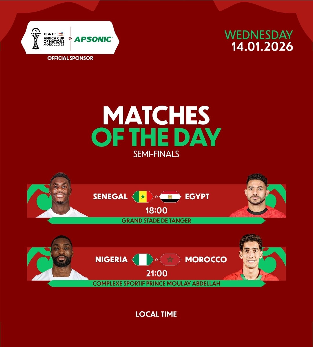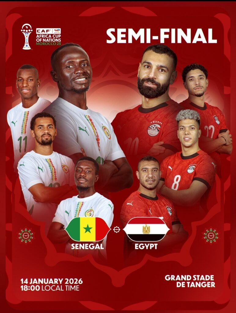 تتجه أنظار عشّاق كرة القدم الإفريقية اليوم إلى مباراتي نصف نهائي كأس أمم إفريقيا 2025، حيث يلتقي منتخب مصر مع السنغال بمدينة طنجة، فيما يواجه المنتخب الوطني المغربي نظيره النيجيري بالعاصمة الرباط، في مواجهتين تعدان من العيار الثقيل.