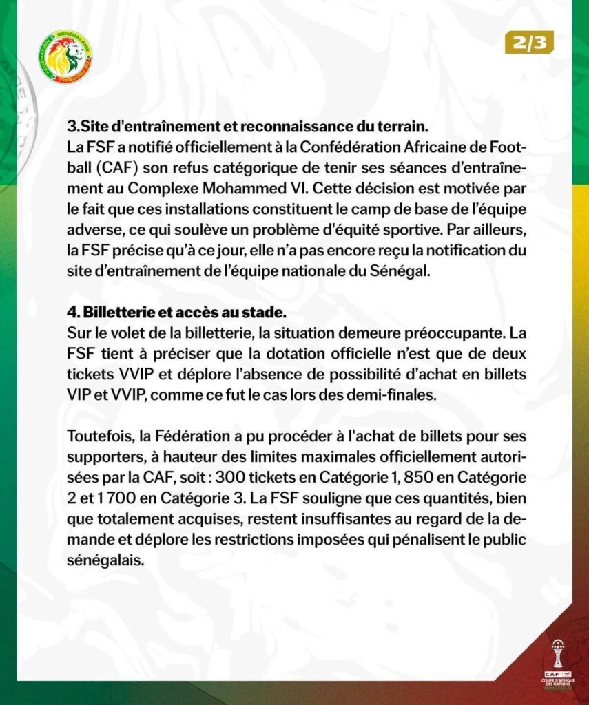 كما أعلن الاتحاد السنغالي رفضه إجراء الحصص التدريبية بمركب محمد السادس، مبررًا ذلك بكونه مقر إقامة وتدريب المنتخب المنافس، وهو ما يطرح – حسب البلاغ – إشكالًا يتعلق بتكافؤ الفرص والعدالة الرياضية، مشيرًا في الوقت ذاته إلى أنه لم يتوصل، إلى حدود تاريخ البلاغ، بإشعار رسمي بخصوص ملعب تدريباته.