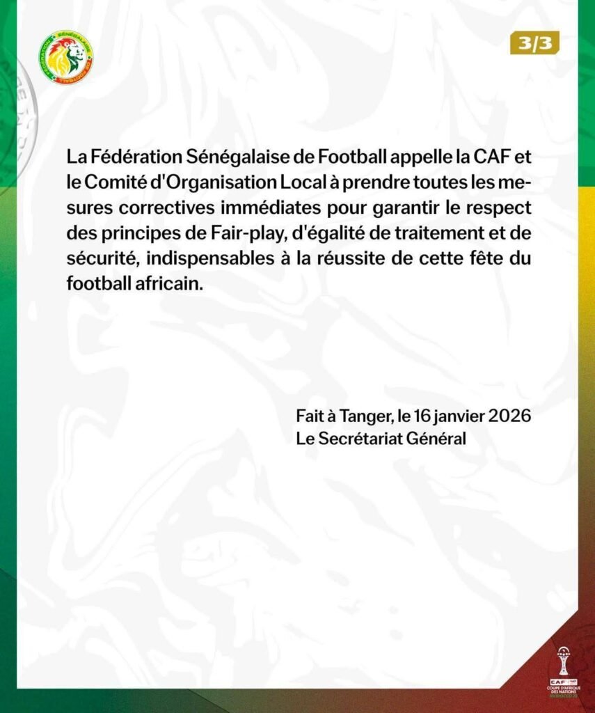 وفي ختام البلاغ، دعا الاتحاد السنغالي لكرة القدم الكونفدرالية الإفريقية لكرة القدم واللجنة المنظمة المحلية إلى اتخاذ إجراءات تصحيحية عاجلة، بما يضمن احترام مبادئ اللعب النظيف، والمساواة في المعاملة، والسلامة، لإنجاح هذا العرس الكروي القاري.