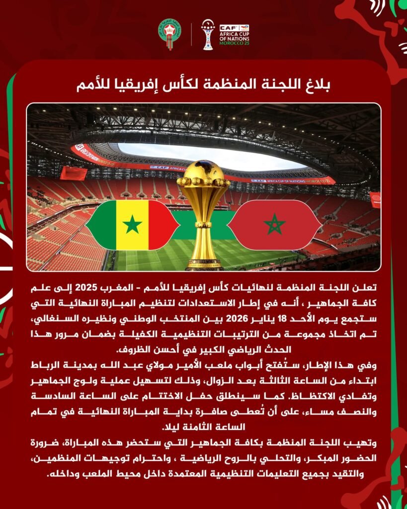 أعلنت اللجنة المنظمة لنهائيات كأس إفريقيا للأمم المغرب 2025 عن جملة من الترتيبات التنظيمية الخاصة بالمباراة النهائية، التي ستجمع يوم الأحد 18 يناير 2026 بين المنتخب الوطني المغربي ونظيره السنغالي، وذلك في إطار الحرص على إنجاح هذا الحدث الكروي القاري وضمان مروره في أفضل الظروف.