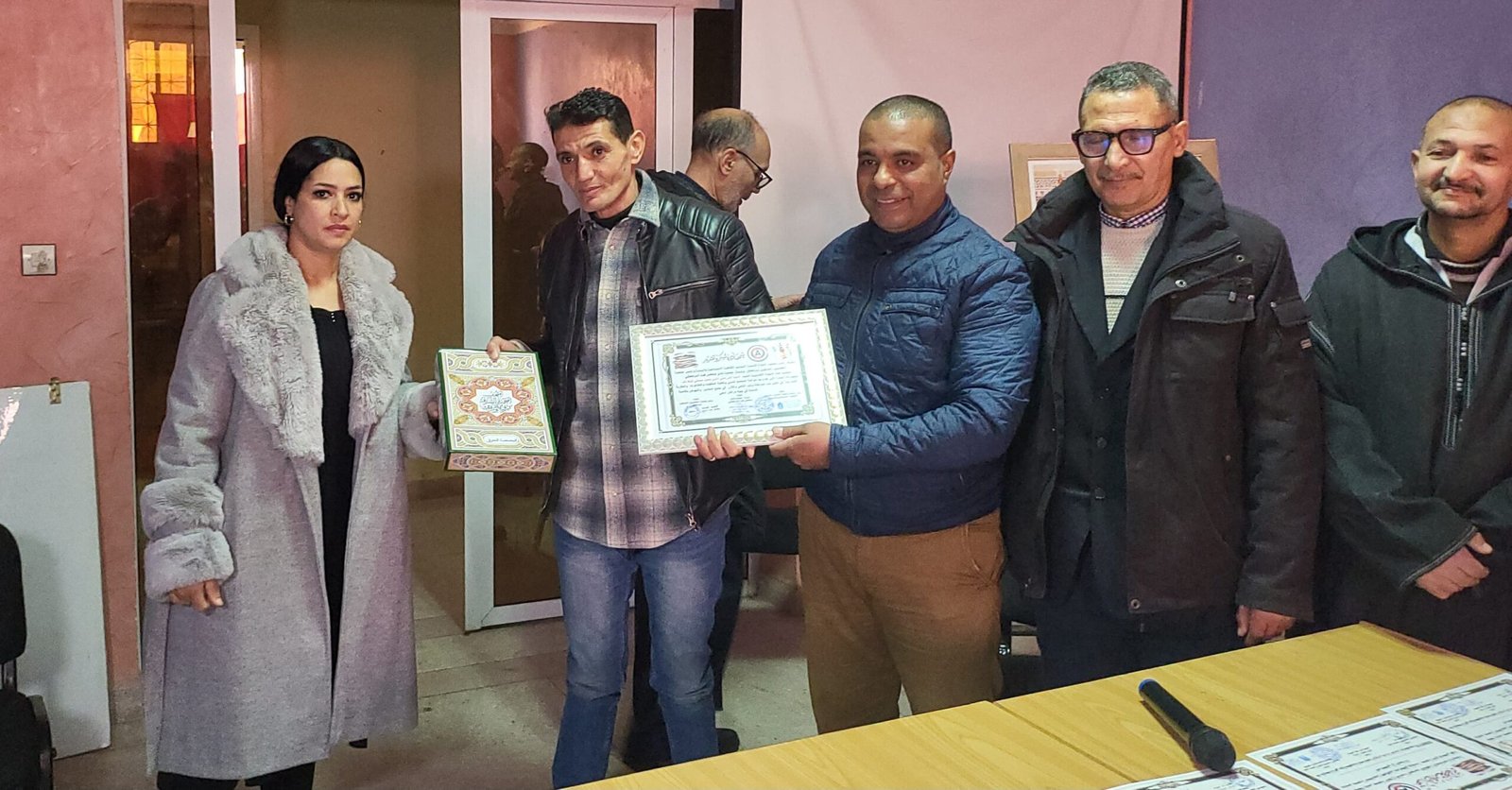 في ختام اللقاء، كُرم كل من الصحفي المهني أزوهار عبد الفتاح عن جريدة « الملاحظ جورنال » والمصور الصحفي أنس محي الدين بموقع « شوف تيفي ». أعرب السيد هشام الجلاد، رئيس الجمعية، عن شكره للحضور الكريم، وبدأ بتوزيع الشهادات التقديرية على المكونين. ووجه شكره أيضًا لكل من ساهم في إنجاح الدورة التكوينية، بما في ذلك السلطات الأمنية والمحلية وفعاليات المجتمع المدني وأعضاء الجمعية.