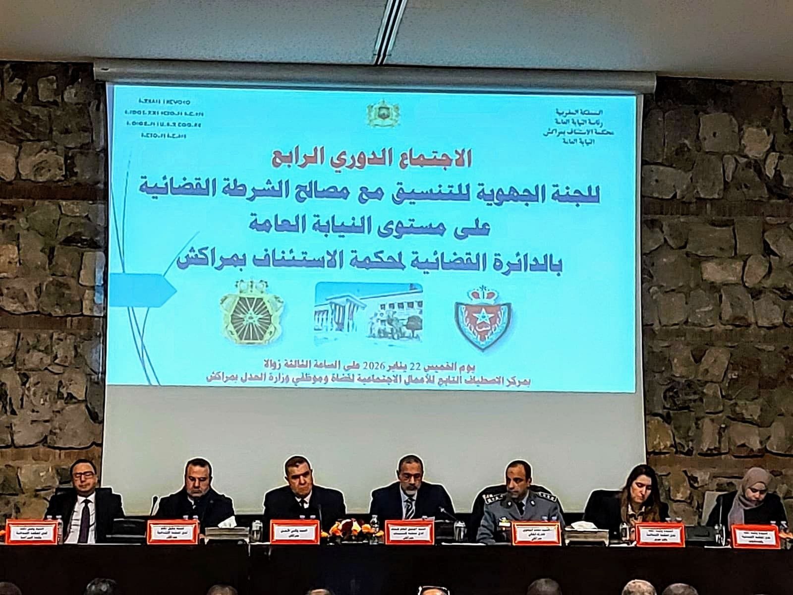 ترأس الوكيل العام للملك لدى محكمة الاستئناف بمراكش، الأستاذ خالد كردودي، يوم الخميس 22 يناير 2026، أشغال الاجتماع الرابع للجنة الجهوية للتنسيق مع مصالح الشرطة القضائية، المنعقد على مستوى الدائرة القضائية لمحكمة الاستئناف بمراكش، وذلك بحضور السادة وكلاء الملك، والسيد والي أمن مراكش، والسيد القائد الجهوي للدرك الملكي، إلى جانب باقي أعضاء اللجنة.