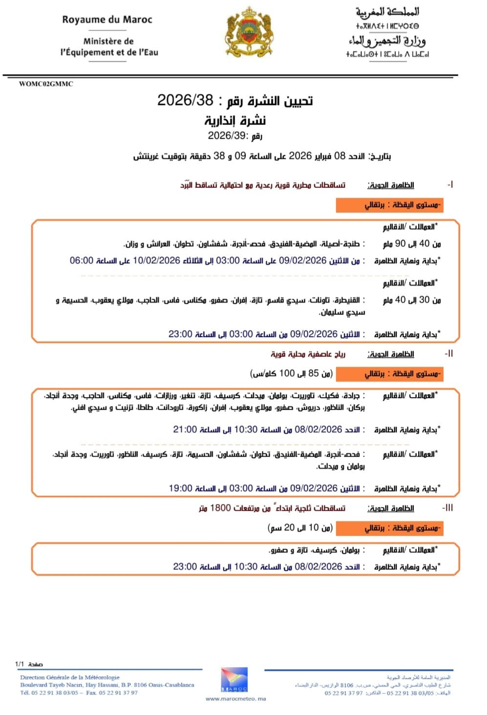 كما ستعرف المرتفعات ابتداءً من 1800 متر تساقطات ثلجية من 10 إلى 20 سم بمناطق بولمان، كرسيف، تازة وصفرو. ذلك اليوم الأحد 08 فبراير من 10:30 إلى 23:00.