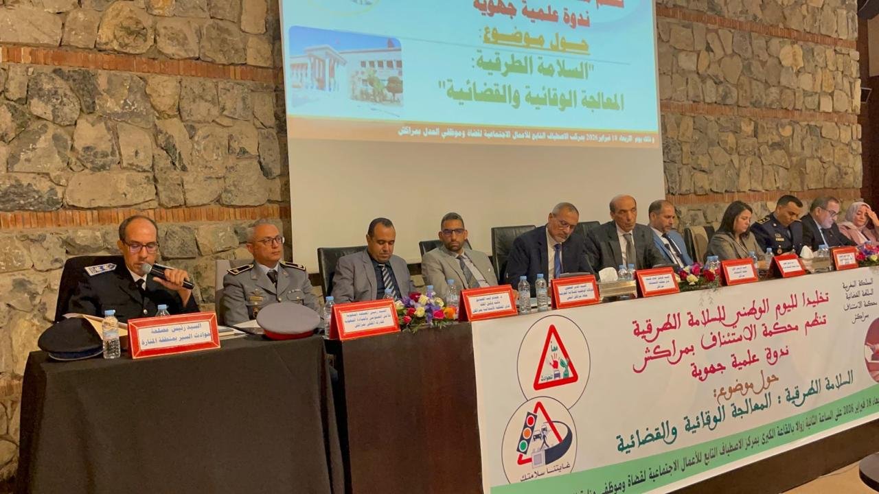 إلى مداخلات علمية سلطت الضوء على سبل تعزيز الوقاية و تقوية التنسيق بين المؤسسات المتدخلة، فضلا على مناقشة الجوانب القانونية المتعلقة بزجر المخالفات و حماية مستعملي الطريق ، و عرف النقاش تفاعلا إيجابيا تم من خلاله النظري حول آليات تطوير العمل الوقائي للحدث من ظاهرة حوادث السير، و توجت ذات الندوة و بصياغة مجموعة من التوصيات العلمية من أجل تعزيز التنسيق بين مختلف المتدخلين، مع ضرورة تكثيف الحملات التحسيسية، و دعم الجهود القضائية و المؤسساتية الهادفة إلى ترسيخ ثقافة السلامة الطرقية، اللقاء شهد حضورا لافتا للعناصر الأمنية و الدرك الملكي و الوقاية المدنية، و ممثل هيئة المحامين بمراكش و المجلس العلمي، و ممثلي الأكاديمية الجهوية للوكالة الوطنية للسلامة الطرقية ، إضافة إلى هيئة العدول و مجموعة من الفاعلين و المهتمين بمجال السلامة الطرقية .