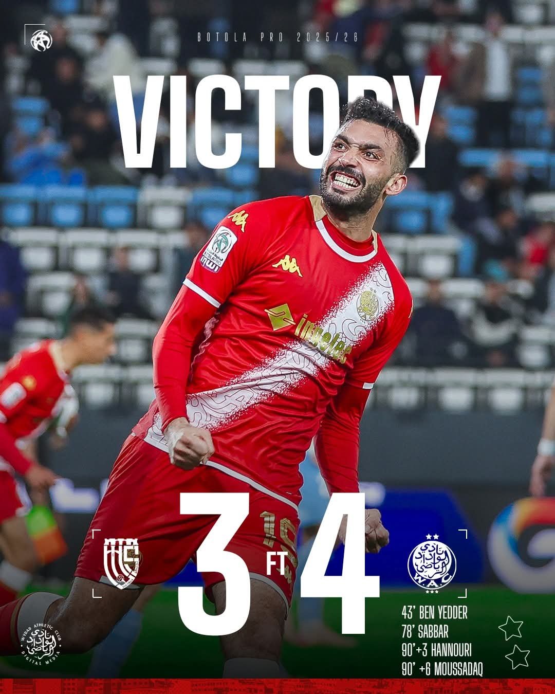 ففي مباراة حافلة بالأهداف، قلب الوداد الرياضي تأخره أمام مضيفه اتحاد تواركة إلى فوز مثير بنتيجة 4-3. وكان اتحاد تواركة سبّاقاً للتسجيل بهدفين في الشوط الأول، قبل أن يقلص الوداد الفارق. وفي الشوط الثاني عزز أصحاب الأرض تقدمهم بهدف ثالث، غير أن الوداد عاد بقوة في الدقائق الأخيرة، مسجلاً ثلاثة أهداف متتالية، آخرها في الوقت بدل الضائع، ليخطف فوزاً ثميناً رفع به رصيده إلى 29 نقطة في المركز الثاني، بينما ظل اتحاد تواركة في المركز الرابع عشر بـ 9 نقاط.