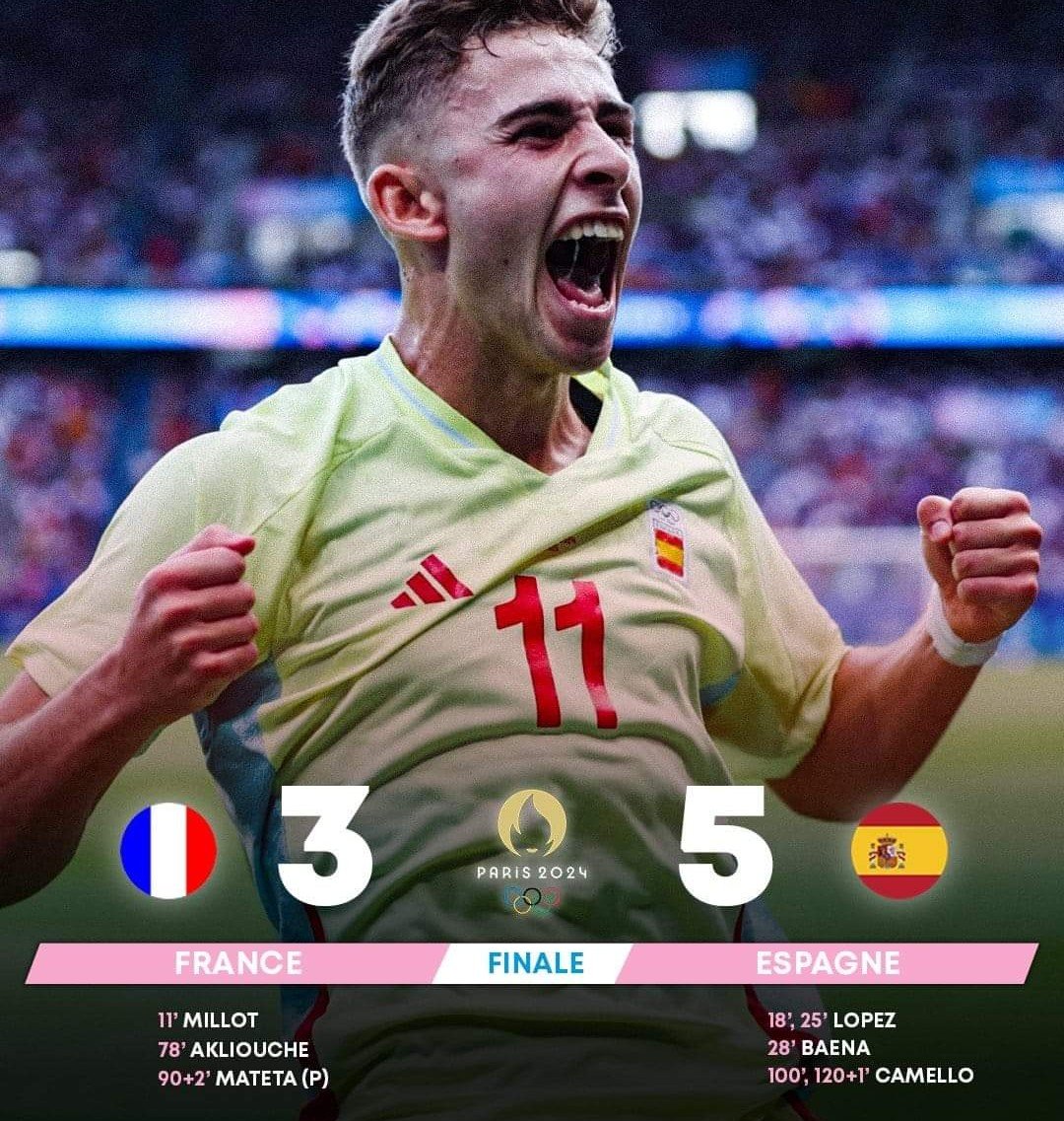 حقق منتخب إسبانيا الأولمبي ذهبية دورة الألعاب الاوليمبية باريس 2024، بعد تغلبه على منتخب فرنسا بخمسة أهداف مقابل ثلاثة في المباراة النهائية التي جمعتهما اليوم على ملعب حديقة الأمراء.أحرز أهداف إسبانيا كل من فيرمين لوبيز هدفين في الدقيقتين 18 و25 وباينا في الدقيقة 28 وكاميلو في الدقيقتين 100 و118، وأحرز أهداف منتخب فرنسا ميلوت في الدقيقة 12 وماجني أكليوش في الدقيقة 79 وماتيتا في الدقيقة 92.وكان الشوط الأول من مباراة فرنسا ضد إسبانيا قد انتهى بتقدم الأخير بثلاثة أهداف مقابل هدف في المباراة التي تجمع المنتخبين في المباراة النهائية لمنافسات كرة القدم في أولمبياد باريس 2024، على ملعب « حديقة الأمراء »، معقل فريق باريس سان جيرمان.الشوط الثاني بدأ بهجوم مكثف لمنتخب فرنسا أملا في إدراك التعادل، إلى أن نجح اكليوش في إحراز الهدف الثاني لمنتخب بلاده في مرمى إسبانيا في الدقيقة 80 من عمر نهائي باريس 2024 لتصبح النتيجة 3-2 لإسبانيا.وقبل نهاية المباراة بدقائق يحتسب حكم المباراة ركلة جزاء لمنتخب فرنسا يتصدى لها ماتيتا محرزا هدف التعادل في الدقيقة 92 ليلجأ الفريقان إلى الوقت الإضافي
