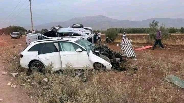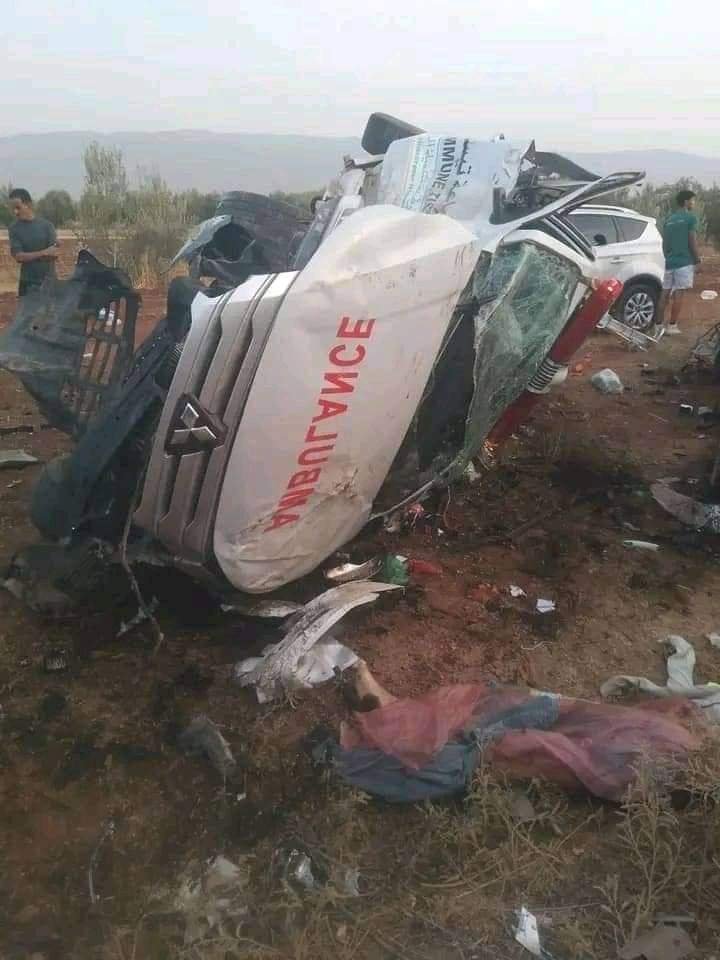 حادثة سير مميتة ، على إثر اصطدام قوي بين سيارة إسعاف و سيارة مرقمة بالخارج ،
