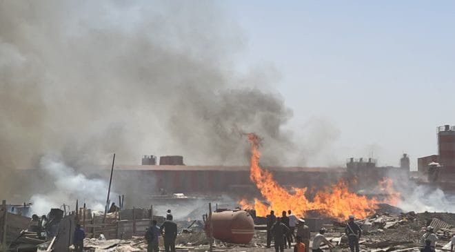 اندلع حريق مهول يوم الثلاثاء الثالث عشر من الشهر الجاري بمجموعة من البراريك المتواجدة بسوق المتلاشيات ( لافيراي) بجماعة سعادة، و حسب مصادر الدولية للإعلام فإن ضباب كثيف من الدخان غطى سماء المنطقة قريبا من مقاولة تعمل في مواد البناء الواقعة قرب أسواق مرجان في الطريق الوطنية الرابطة بين مراكش و الصويرة ، الحريق عرف استنفار مصالح الدرك الملكي و رجال الإطفاء معززين بصهاريج مائية لإخماد النيران قبل أن تشمل باقي المناطق المجاورة خاصة مع ارتفاع درجات حرارة مراكش و الرياح القوية التي تشهدها المدينة في هذا الصيف.