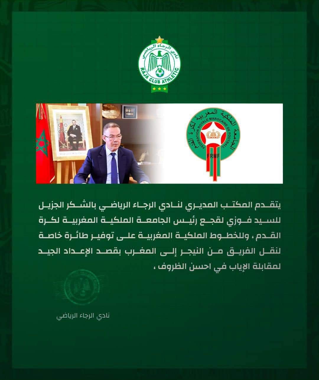 وجه الرجاء الرياضي عبارات الشكر والامتنان لفوزي لقجع، رئيس الجامعة الملكية المغربية لكرة القدم بعد أن خصص طائرة لبعثة الفريق الاخضر من أجل العودة إلى أرض الوطن استعدادا لمباراة الإياب أمام الحرس الوطني من النيجر.