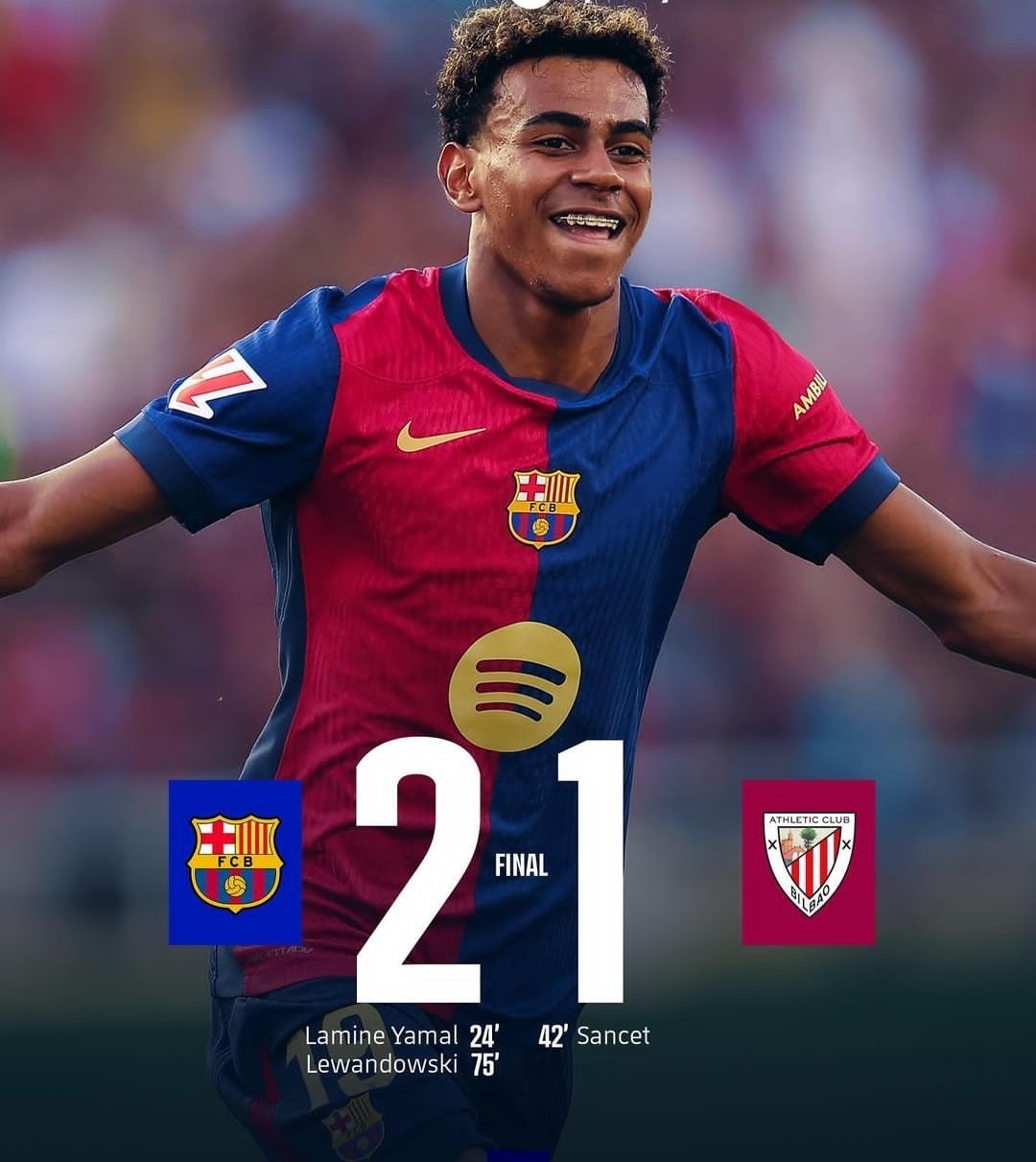 فاز فريق برشلونة على نظيره أتلتيك بيلباو بنتيجة 2-1 في المباراة التي أقيمت بينهما مساء أمس السبت على ملعب « مونتوجويك الأولمبي »، ضمن مباريات الجولة الثانية من منافسات الدوري الإسباني للموسم الحالي 2024-25.و جاءت أهداف المباراة عن طريق كل من لامين يامال، وروبرت ليفاندوفسكي في الدقيقتين 24 و75 على التوالي لصالح نادي برشلونة، بينما أحرز أوهيان سانسيت من ركلة جزاء بالدقيقة 42 هدف أتلتيك بيلباو الوحيد.