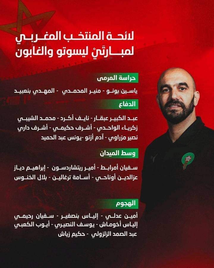 أعلن الناخب الوطني وليد الركراكي، صباح اليوم الخميس 29 غشت الجاري، عن القائمة الرسمية للمنتخب المغربي المستدعاة للمشاركة في مباراتي الغابون، وليسوتو، لحساب التصفيات المؤهلة لنهائيات كأس أمم أفريقيا.