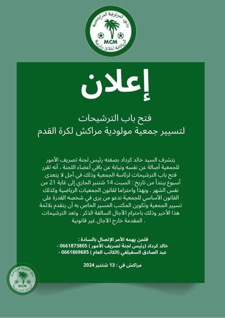 أكد بلاغ صادر عن لجنة تصريف أمور جمعية نادي مولودية مراكش لكرة القدم بلاغا تعلن من خلالها عن فتح باب الترشيحات لرئاسة الفريق و تم تحديد تاريخ وضع لوائح الترشح لشغل منصب الرئاسة من الرابع عشر شتنبر إلى الواحد و العشرين منه، و جاء في ذاث البلاغ انه يستلزم على كل من يرى نفسه مؤهلا لقيادة الفريق أن يكون جديرا و قادرا على تحمل المسؤولية مع اختيار الأعضاء من ذوي الكفاءات و التجربة و بإمكانهم العودة بالمولودية إلى المسار الصحيح. و يذكر أنه بعد استقالة المكتب المسير السابق الذي كان يرأسه عزيز بن جوهرة و الفريق يعيش فراغا إداريا قاتلا حيث تهرب مجموعة من الأشخاص من تحمل مسؤولية الرئاسة جراء الإكراهات المادية التي تلازم المولودية منذ عدة مواسم مما دفع بلجنة تصريف أمور الفريق إلى إصدار البلاغ ( تتوفر الدولبة للإعلام على نسخة منه ) في محاولة من أجل إنقاذ المولودية من الانذتار.
