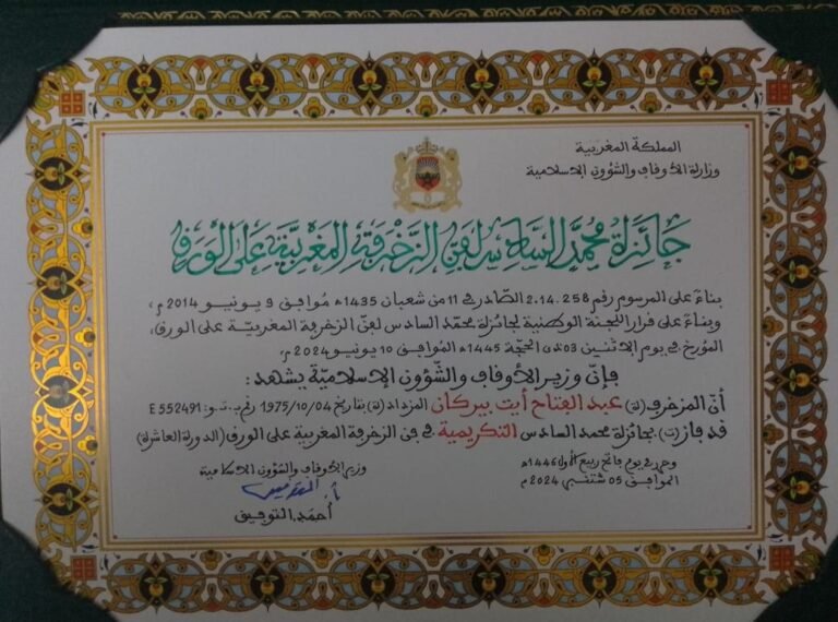 فاز الرسام المراكشي عبد الفتاح ايت بيركان بجائزة محمد السادس التكريمية في فن الزخرفة المغربية على الورق الذي عرف مشاركة مجموعة من الرسامين في هذا المجال، و كان ايت بيركان يشتغلون قطاع الصناعة التقليدية قبل أن يستهويه هذا الفن قبل أن تتفق موهبته في فن الزخرفة على الورق و يفرض وجوده كواحد من رواد هذا المجال في مراكش التي رأى النور فيها في الخامس عشر أكتوبر 1975 .