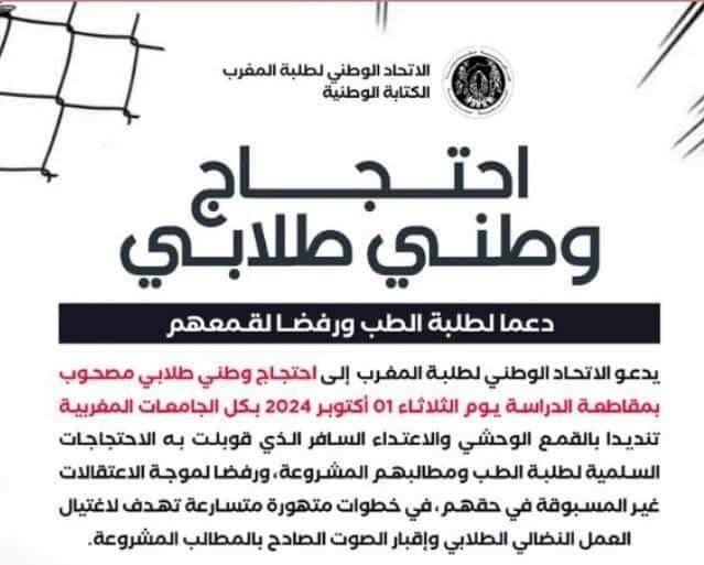 هذه الدعوة تأتي استنكاراً للقمع الذي تعرضت له الاحتجاجات السلمية لطلبة الطب والصيدلة، ورفضاً للاعتقالات غير المسبوقة التي طالت العديد منهم.وأكد الاتحاد أن هذه الإجراءات “القمعية” تستهدف القضاء على الحراك الطلابي المشروع وكتم صوت المطالب العادلة، في خطوات وصفها بالمتهورة التي تهدف إلى “اغتيال العمل النضالي” وطمس الأصوات التي تدافع عن الحقوق الأساسية للطلبة.