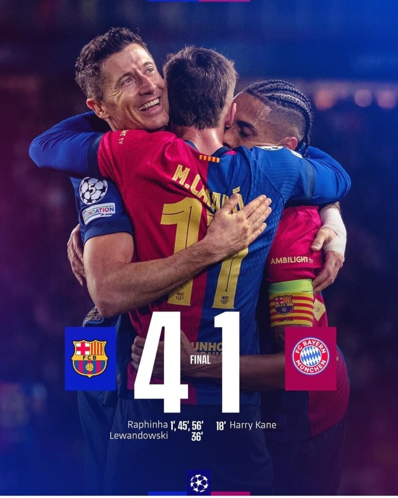 فاز برشلونة ضد بايرن ميونخ بنتيجة 4-1 فى المباراة التى شهدت تسجيل رافينيا لهاتريك في اللقاء الذى جمعهما مساء الأربعاء، بالجولة الثالثة من مرحلة الدوري لبطولة دوري أبطال أوروبا والتي أقيمت على ملعب لويس كومبانيس الأولمبي الشهير بملعب مونتجويك.ورفع برشلونة رصيده إلى 6 نقاط بعد فوزه الثانى بالبطولة بينما تجمد بايرن ميونخ عند 3 ليرتقى الفريق الإسبانى للمركز العاشر، ويتراجع البافارى للمركز 23 بجدول ترتيب دوري أبطال أوروبا بعد الجولة الثالثة.وهكذا يسدل الستار على قمة هذا الاسبوع في انتظار اللقاء الذي سيجمع برشلونة ضد غريمه ريال مدريد في مباراة الكلاسيكو يوم السبت المقبل.