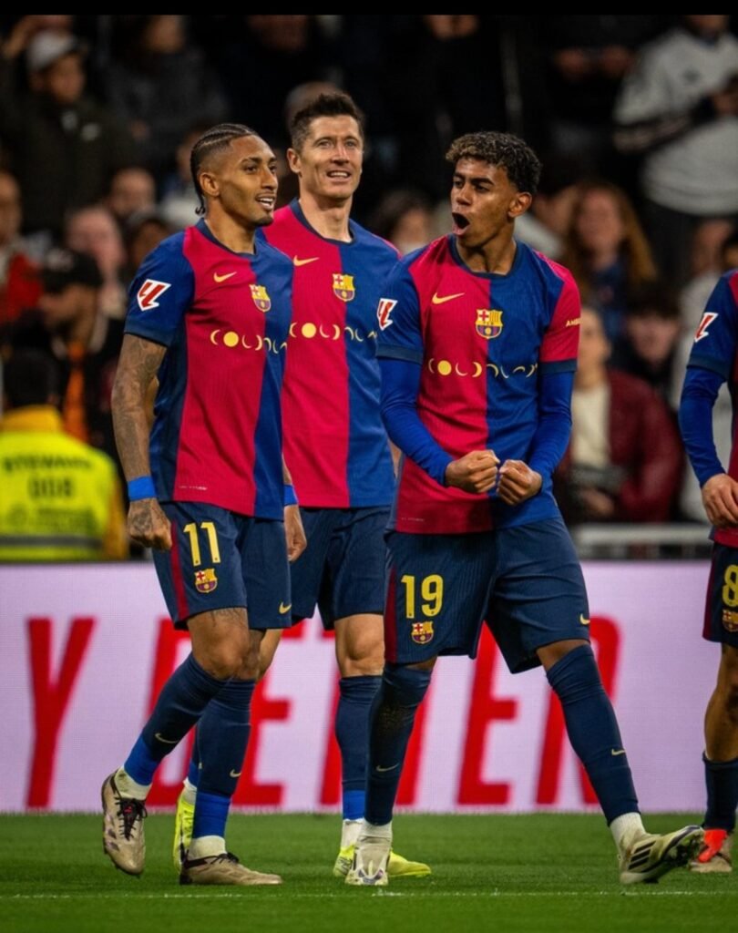 حقق فريق برشلونة فوزا كبيرا على غريمه التقليدي ريال مدريد بأربعة أهداف نظيفة، خلال كلاسيكو الأرض الذي جمع الفريقين مساء اليوم على ملعب « سانتياجو بيرنابيو » معقل الفريق الملكي، ضمن منافسات الجولة الحادية عشرة من عمر مسابقة الدوري الإسباني للموسم الحالي 2024-2025.انتهى الشوط الأول سلبيا بين الفريقين، ومع بداية ابان برشلونة عن نواياه الهجومية ، ما أكدته ثنائية النجم البولندي روبرت ليفاندوفسكي في غضون دقيقتين فقط 54 و56 على التوالي، من خلال انفراد بالمرمى وضربة رأسية.وتم إلغاء هدفين لفريق ريال مدريد بداعي التسلل على كيليان مبابي الذي سجل الهدفين.وفي الدقيقة 77، قبل ان ينجح ميسي الجديد في برشلونة (لامين يامال) في إحراز الهدف الثالث، قبل أن يضيف رافيميا الهدف الرابع بطريقة فيها اللمسة البرازيلية ، في الدقيقة 84، لينتهي اللقاء بفوز مدوي للبارسا في معقل الريال.